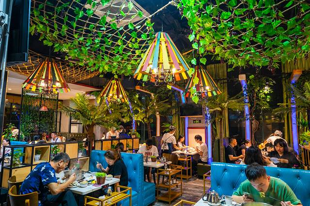 环境:整体装修风格偏原始热带丛林风和工业朋克风,两种风格混合,就餐环境很有特色,在这种环境和氛围里,吃海南本土特色的椰子文昌鸡,别有一番滋味。