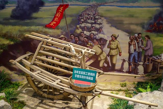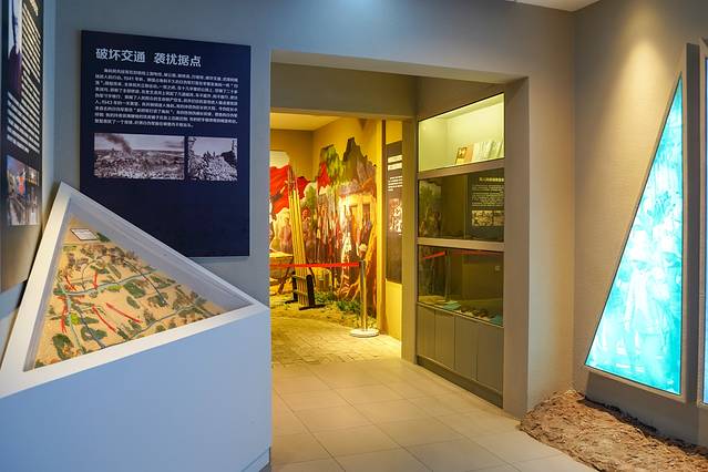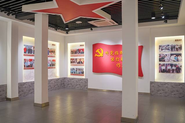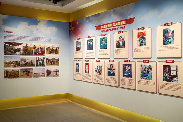 奶白色的墙体,红色的字迹,两侧玻璃拼错,角斜红旗民兵团史绩陈列馆映入眼帘,正前方的壁画绘声绘色,将旧时浴血奋战的英姿刻画得淋漓尽致,让人瞬间充满敬意。