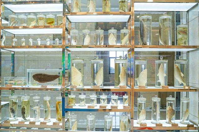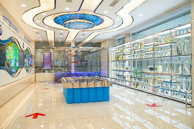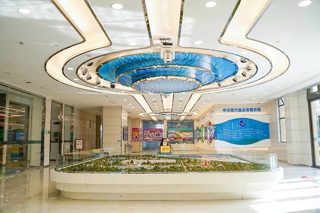 首先来到的大厅展示了中洋现代渔业发展历史,明亮的地砖与绘声绘色的墙壁相互映衬,时不时有蓝色元素点缀,尽显海洋气息,最让人目不转睛的是展厅的几百种干湿标本,静静陈列在展柜中,错落有致,这些看似其貌不扬的小家伙,都像似一只只拥有魔法的精灵,窃窃私语,向游人分享着一个个有趣生动的故事,光是看着这些奇妙的标本,就足以让人驻足停留一整天。