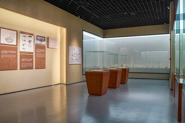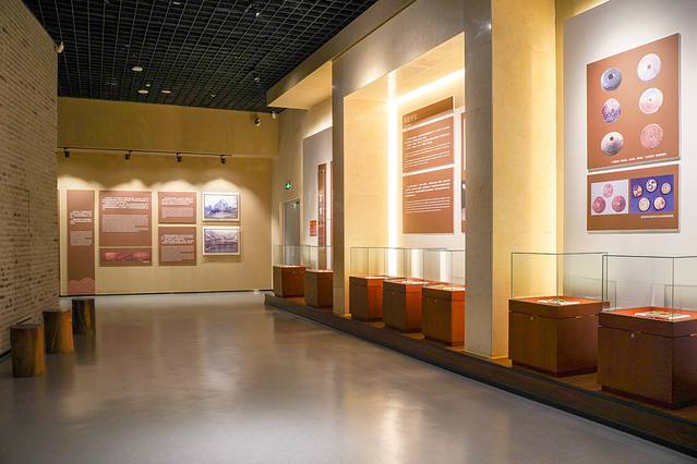 馆内陈列以米黄色为主体,深浅纹理相互拼错,营造出几分历史神秘感,同时加上灰色地砖的映衬,又多了一丝高级感,极为考究。