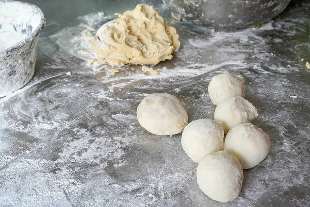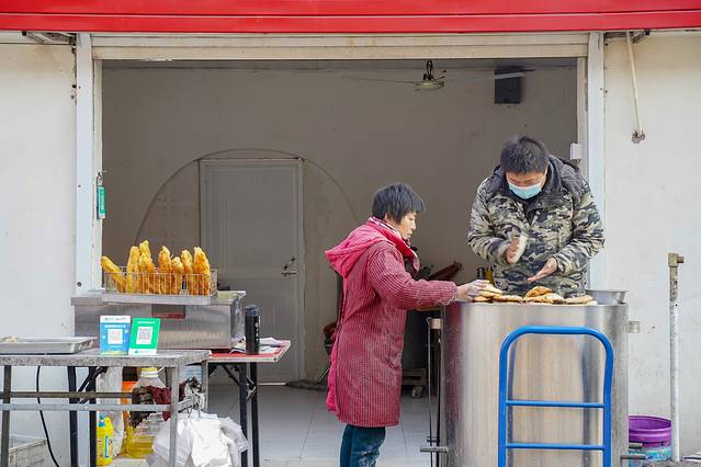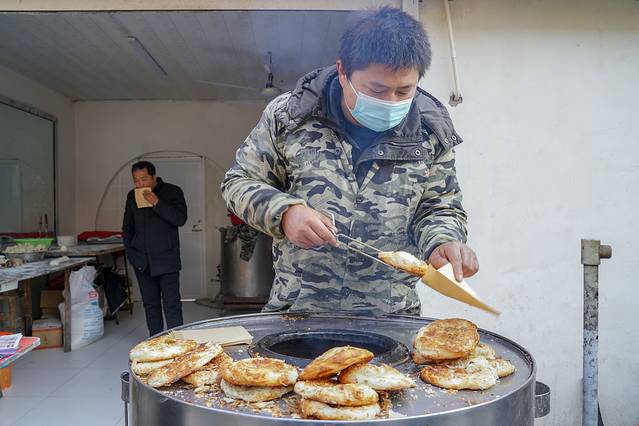 烤饼店的主人是一男一女,女人负责擀面,男人负责贴锅拿饼,烤饼外酥里脆,入口松软却不散,油而不腻,刚出锅时,香飘十里,四周洋溢着热气腾腾的幸福。还未等烤饼出锅,垂涎不已的客人就已经按捺不住了,试图用小动作掩饰自己的蠢蠢欲动。