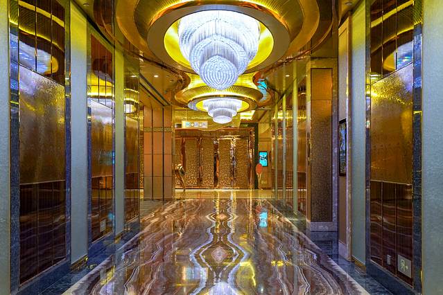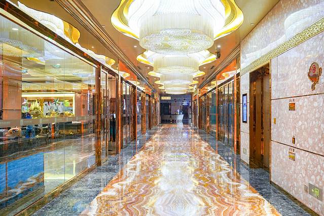 移步来到长廊,仿佛走进了高贵奢华的古典教堂,顶部是大型水晶灯,放眼望去,宛若无数条游动的鱼,扑朔迷离,极具科技力量。地砖的设计同样别出心裁,黄蓝交织,加上纹理拼错,尽显精致,处处彰显富丽堂皇。