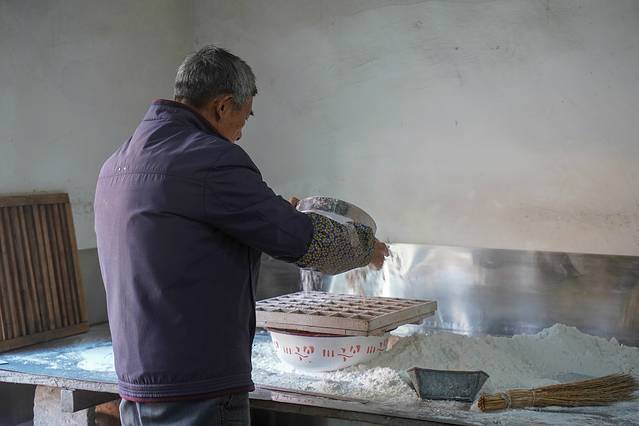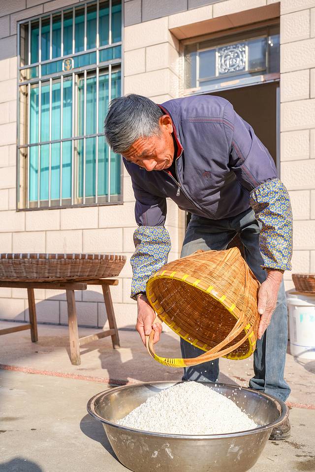 选米过后便是兑米,糯米和籼米的比例需要调和成6:4,使其充分混合。紧接着是淘米、浸泡、沥干和插水,说起插水,许多朋友会表示一头雾水,指的是将米粉放在竹匾中,然后挖上几个小坑,再将水倒入坑中,水量的多少极为讲究。