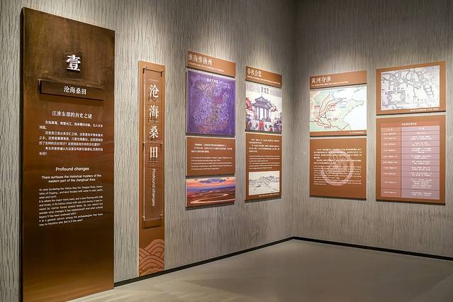 漫步博物馆,随处可见精心陈列的玻璃展柜,和绘声绘色的图文背景墙。走进第一部分——沧海桑田,揭开江淮东部的历史之谜,从春秋会盟到黄河夺淮,将江淮的千年历史细细说来,那些看似毫不起眼的文字,都成为历史画卷中的一语成谶。