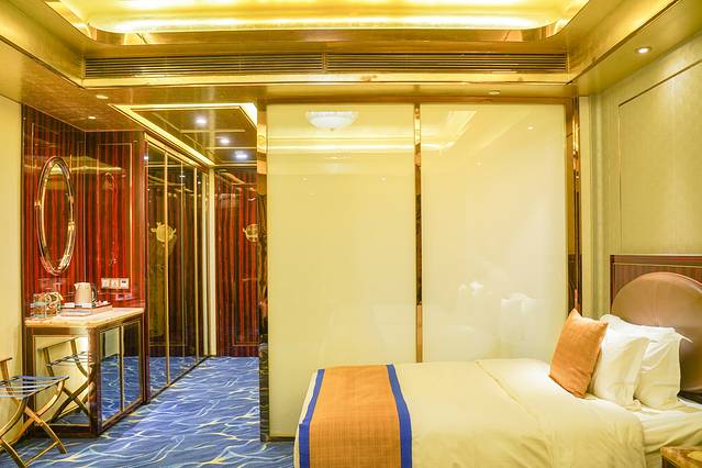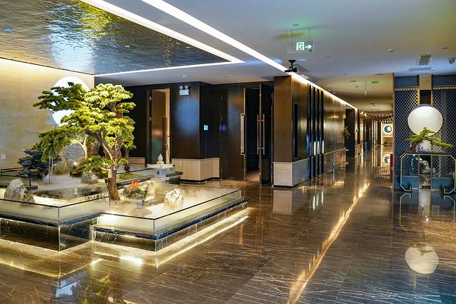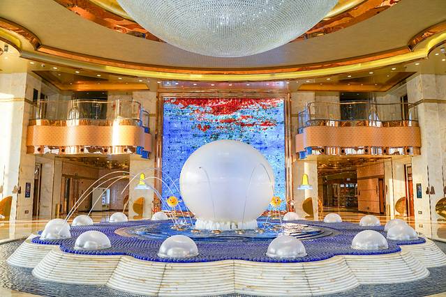 初见酒店,就被其金碧辉煌的外观所吸引,黄蓝相间的图标,将艺术玩弄于鼓掌之中。步入酒店,眼前的一切更是令我目不转睛,大堂面积高达1600多平,头顶是由3万颗水晶珠组成的巨无霸水晶灯,与下方的“圆形地球”遥相呼应,共同组成一道独特的水景,将中洋水鱼文化诠释得淋漓尽致。背景是一块320平的LED灯天幕,蓝红碰撞,利用高科技特效相互晕染,营造出独具一格的神秘画布,十分吸睛。