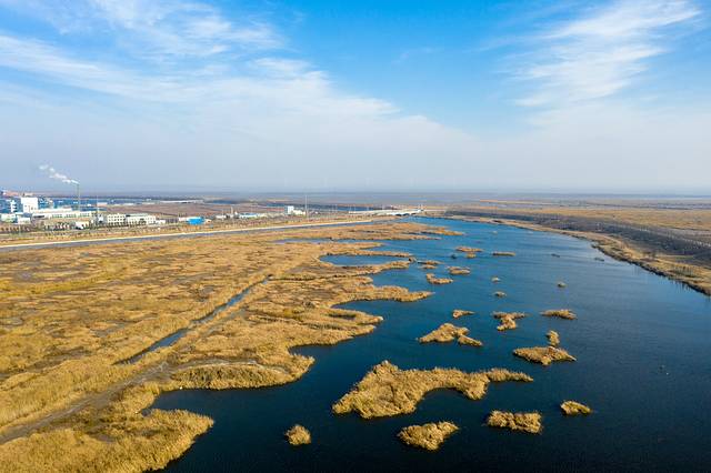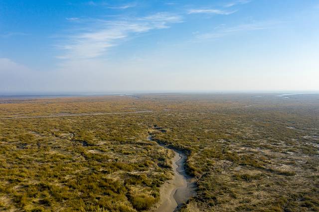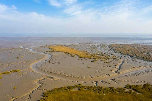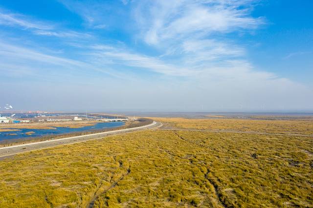 走近后才发现,这是一片芦苇荡,当无数芦苇汇聚成片时,丝毫没有冬日的萧瑟感,宛若一幅油画,美得让人欲言又止。海面平静如止,蔚蓝得像被浸染了一般,与淡蓝的天空相互映衬,显得格外深邃。星星点点的芦苇荡点缀其中,黄蓝碰撞,十分好看。