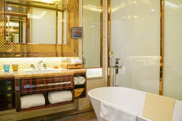 满怀激动的心情来到客房,推开房间的瞬间,淡雅的香味扑鼻而来,瞬间治愈了所有疲乏。洁净舒适的大床、金黄透亮的墙壁,艺术吸睛的地毯,在彰显格调的同时,体现了水鱼文化,将酒店的温度诠释无遗。房间内的家具大多采用金属质感,高级感进一步提升,雍容的同时散发着小资情调,让人赞不绝口。