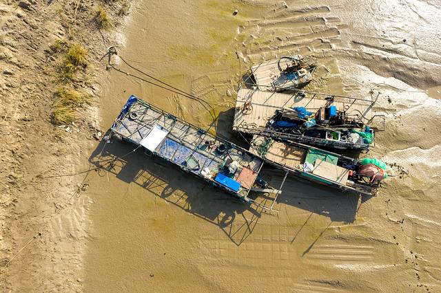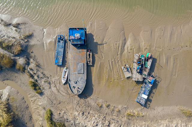 沼泽中,几艘破旧的渔船随意停泊,大小不一,形状各异,船身在风雨的洗礼下尽显斑驳,历史厚重感扑面而来。