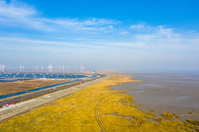 远眺海面,洁白的风车若隐若现,以蓝天白云为背景,宛若铺上了一层画布,营造出一面得天独厚的背景墙,让人倍感希望。