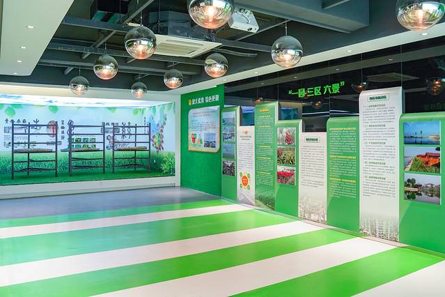馆内以绿色为主调,彰显农业主题,这里的“一园三区六景”十分引人注目,将园区的建设成果一览无遗。