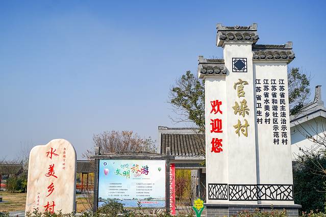 一侧石刻静立,黄底红字,尽显江南柔美。走进官垛村,仿佛走进了一幅流动的江南水墨画,两侧建筑林立,粉墙黛瓦,错落有致,整个村庄被湖环绕,湖面平静如止,清风徐来,泛起淡淡涟漪,四周杨柳依依,一切都显得格外祥和。