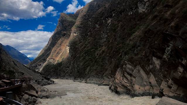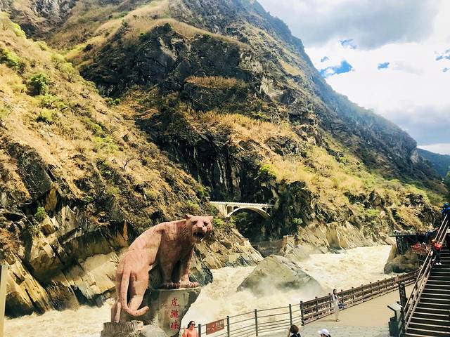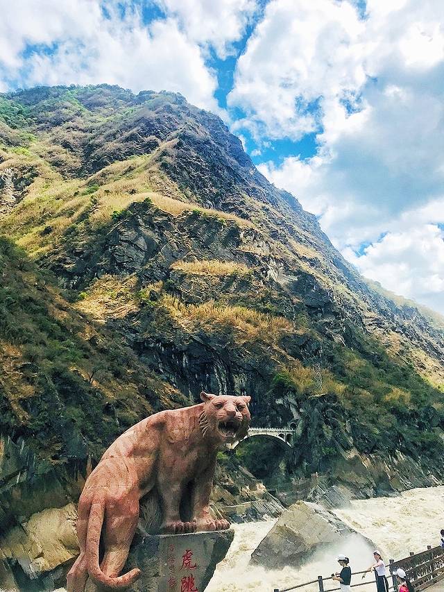 金沙江遇到玉龙雪山和哈巴雪山,让本来平静柔和的江水变成凶悍的猛兽;传说江流最窄处只有30余米,猛虎下山,在江中的礁石上稍抬脚,便可腾空越过,故称虎跳峡。