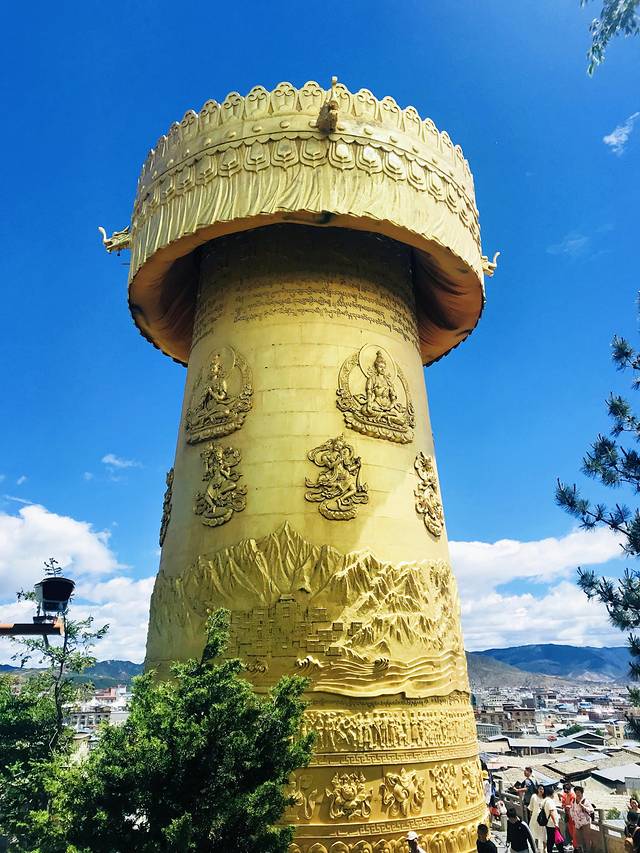 顺着台阶往上走,两旁很多当地居民在卖牦牛肉,价格比较实惠,至于真假我就不会分辨了,吃起来还是不错的。独克宗的顶上是世界上最大的转经筒,在阳光的照耀下,熠熠生辉。始终是世界上最大的转经筒,当然需要很多人一起拉才能转起来,一个人根本拽不动。