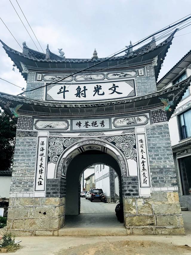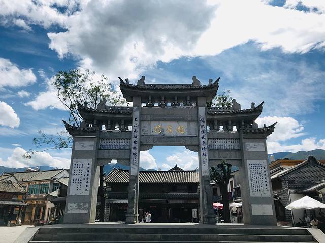 喜洲镇中心四方街,是由店铺围成的小广场。这里竖着一座石坊,这就是近年来修建的“文明坊”。这个地方原来的石坊叫“题名坊”,是明代镇上出了几位进士之后建的,那时候凡是在科举中取得功名的村民都可以把名字刻上。