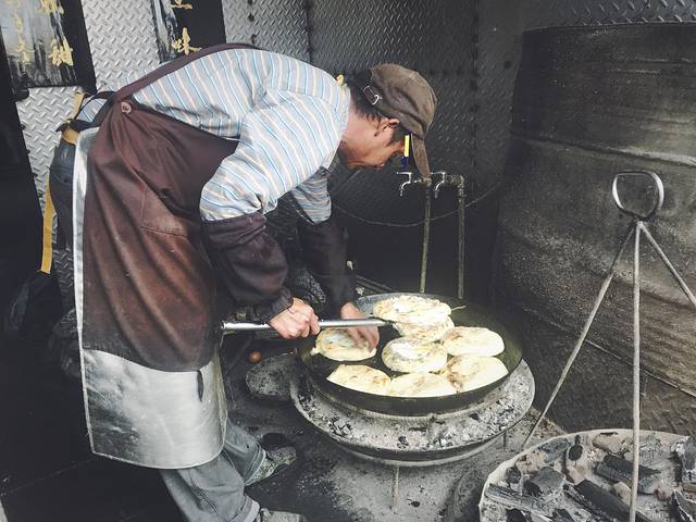 突然闻到一阵香味,循着味道望过去,看到一条长长的队伍,这里是一家很有名的做喜洲粑粑的店。喜洲粑粑就像大饼上面铺着鸡蛋和肉饼,放在笼子里烤,这样烤出来的大饼很香,搭配着鸡蛋和肉饼,不会很干,也不会腻。我买的时候是25元一个肉加蛋,回到客栈,保洁大姐才跟我说本地人去竟然只要10元!