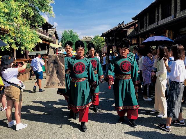 这里每天都会有舞狮表演,还会突然从人群中冒出来一群拿着通缉令的官兵,走到广场上表演电视剧桥段;走着走着还会有招亲活动,主人家站在阁楼上高喊谁可以获得小女芳心,将得到全部家财,惹得众人哄堂大笑。