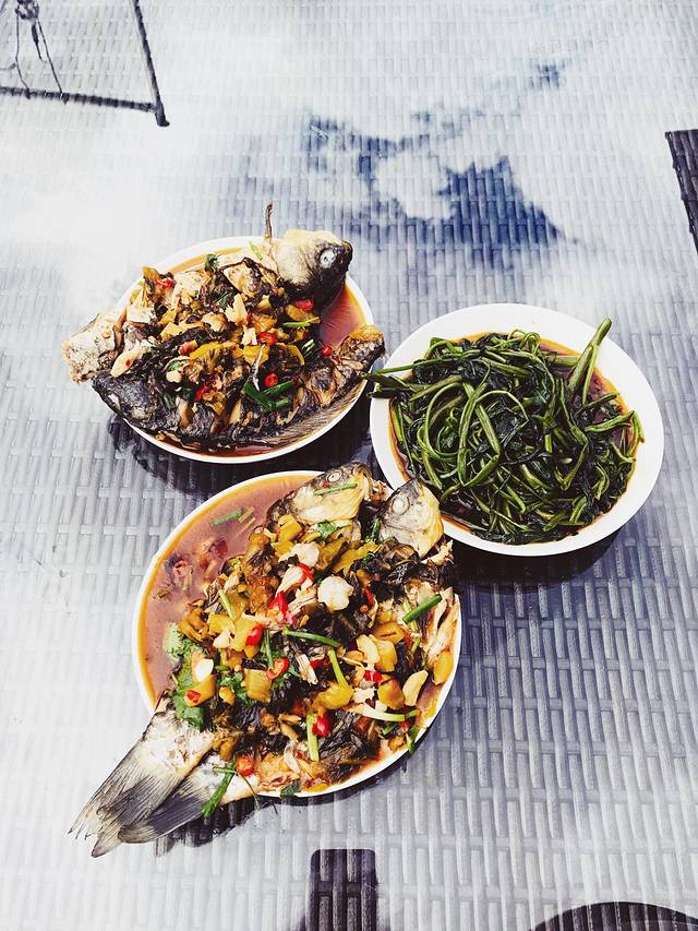 经过长途跋涉,终于到达了客栈,拖着疲惫的身躯往房间走,刚好遇到老板超哥,邀请我一起吃晚饭,就在客栈阳台,他自己做的川菜。简单的鱼和通菜,在美景的衬托下显得美味十足。