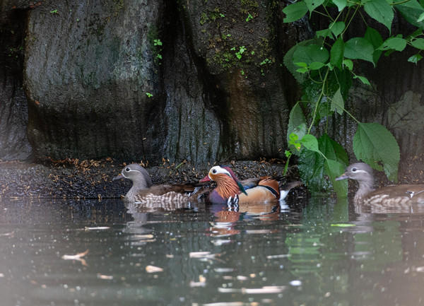 漫步在湖心岛上,忽然,湖面上有鸳鸯的叫声传来,虽然季节不对,但是似乎平常的这里也少不了鸳鸯。寻声望去,只见几对鸳鸯在水中悠闲自在地浮着,雄鸟嘴红色,脚橙黄色,羽色鲜艳而华丽。雌鸟嘴黑色,从头和整个上体灰褐色,成双成对。
