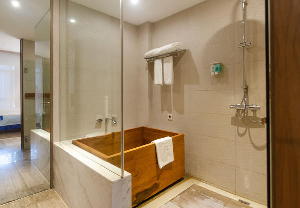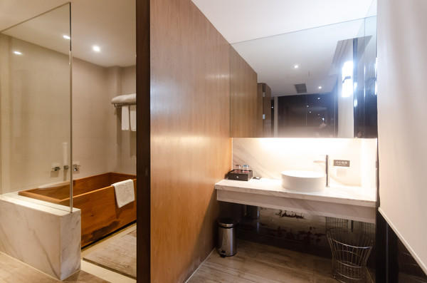走进客房,日式简约的装修风格让初次到访的客人都觉得倍感亲切。每一个房间都配备了一个超大的露天阳台,站在阳台上便能看到俊秀的山峰、秀美的河流。这家酒店最大的特色便是温泉,依河而建38个特色各异的温泉池,多样选择,山语鸟鸣中,体验生命与自然相融的和谐境界。