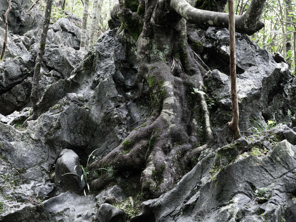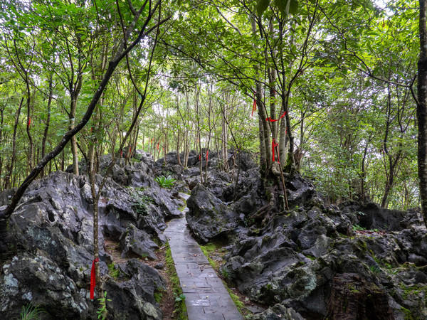 不得不说这座山真的是一座神奇的山,山下有光怪陆离的溶洞,半山腰的山洞里有寺庙,而在山顶上则是一大片的石林。树木生长在石头上本就是罕见的事情,而这片石林则称得上是奇迹,所有的树都是长于石头上,走近看能真切的看到树木的根与石头融为一体。