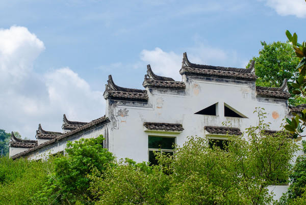 因婺源以前属于徽州,所以这里的建筑也都是徽派建筑,徽派建筑的色调朴素淡雅,粉墙洁白,黛瓦青砖,园林景致精致小巧,曲径通幽,一步一景,有一种别有洞天的幽深感觉,再加上几株修竹茂林,在蓝天白云下,在青山绿水之间的映衬下,显得清新秀丽。