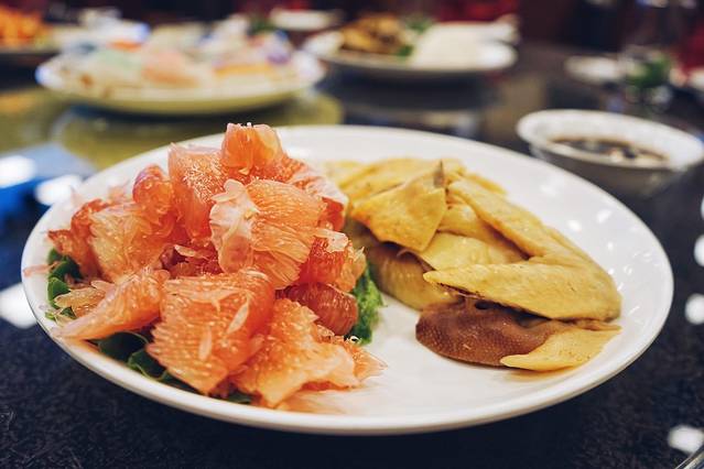 《红心柚拼白切鸡》:红心柚为文成本地品种,农家户户种植,高山无污染,果肉色彩艳丽,果味清香,富含维生素,与本地散养鸡制成的白切鸡同食,营养丰富,口感嫩滑。