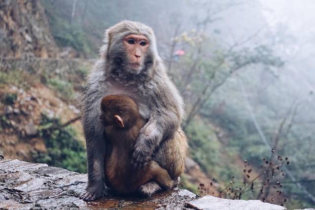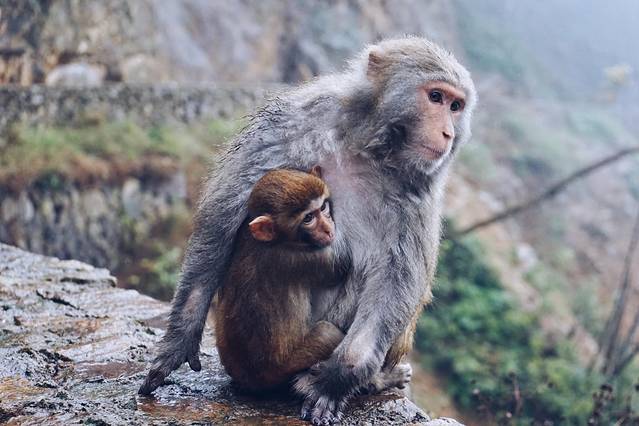 世上最伟大的爱一定是母爱。当天在猴王谷下着雨,小猴子就在母亲的怀里,由母猴来挡风避雨。
