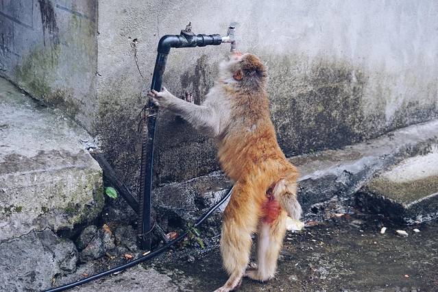 拍这张图的时候,其实挺心塞的。猴子为了喝水,自己去水龙头下喝水。