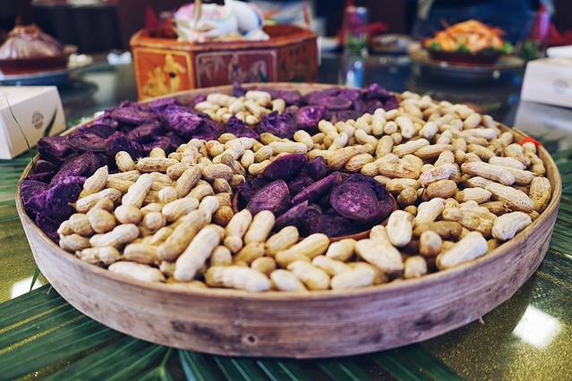 《五谷丰登》:南田刘氏祭祖,传统有三牲五畜,现伯温家宴取芋、薯、粟、花生、土豆等五种杂粮谷物蒸熟替代牲体,象征丰收,即保留了仪式感,又有感恩自然造化,庆祝大地丰收的含义,也符合了现代人的素食风尚。