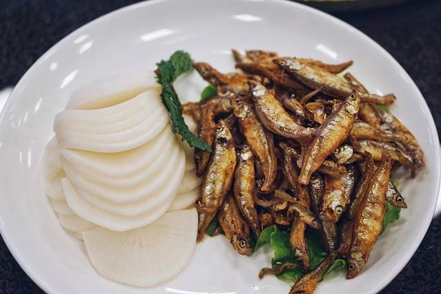 《溪鱼干拼萝卜生》: 文成特产溪鱼干,由溪涧野生鱼晒制而成,无污染鲜香浓郁;萝卜生为文成高山萝卜腌制,清香酸脆。