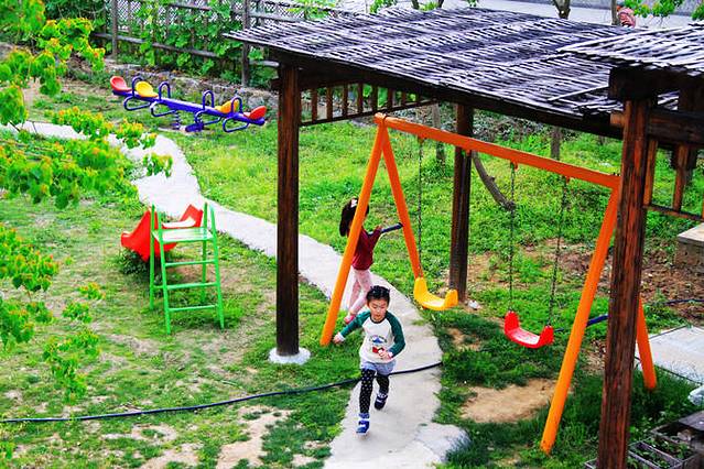 进院门,院子有2个篮球场大,右边是玩乐区,有各种大小朋友玩耍的设备,左边是停车场,能泊十多辆车。