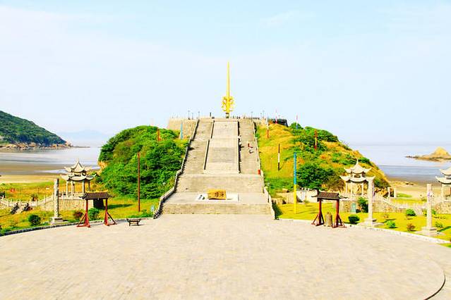 沙滩中间的小屿叫泥螺山,上山的台阶是仿照中山陵建造的,山上的祭海坛气势恢弘,最引人注目的就是坛顶的那根定海神针。