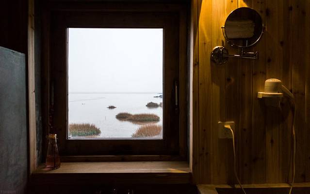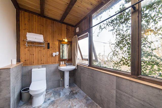 由原木打造的家具散发着淡淡的木头气息,干湿分离的阳光浴房在泡澡的时候也能欣赏到窗外美景。