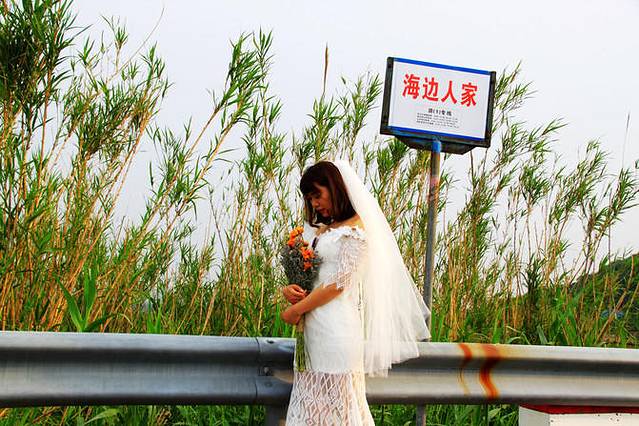 这不,美好就来了,新娘顾自在这个牌子下留影,新郎呢,逃跑了?