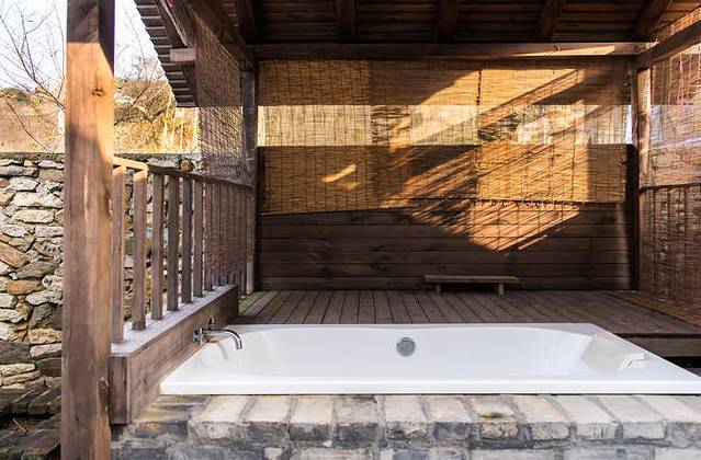 一边泡澡,一边听着山风从耳畔吹过,与TA休憩于此,有种“何处无月,何处竹柏,但少闲事如吾两人者耳”的浪漫。