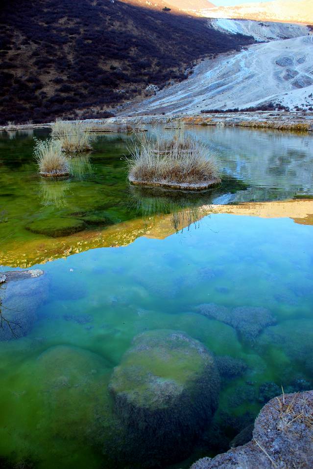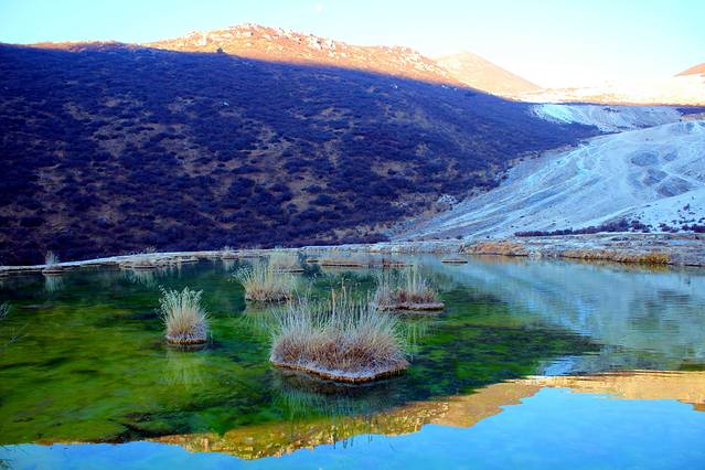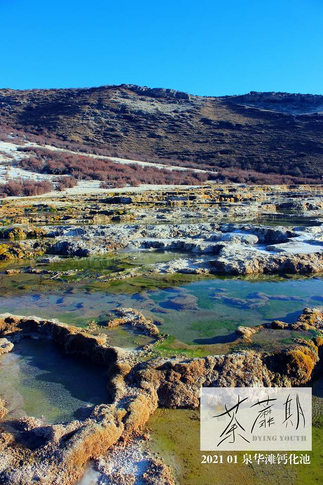 再行不久,泉华滩便出现在了眼前。这种高原钙化池在青藏高原并不算少见,最为出名的大概就是世界遗产松潘黄龙钙化池,甚至和它近邻的九寨沟也有分布,但是不管是黄龙还是九寨沟,那里的钙化池被完好地保护起来,毕竟一个小小的损毁,便是千万年的时光才能修复回来。