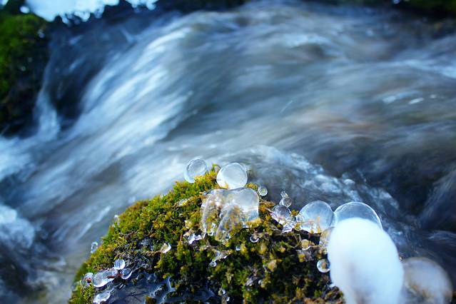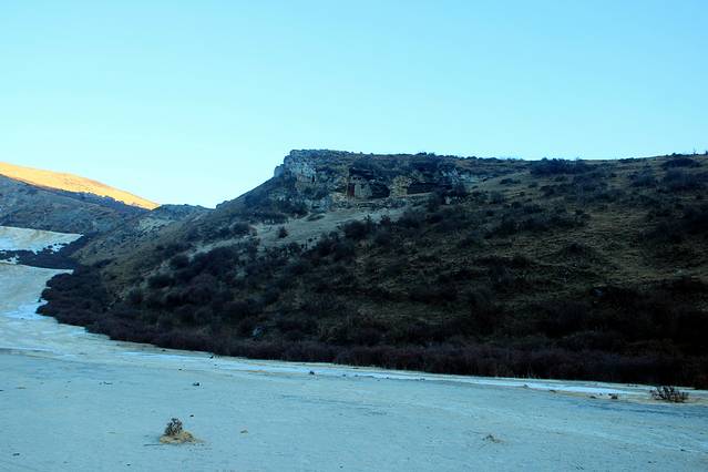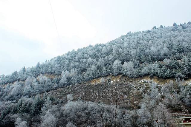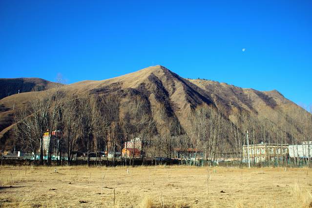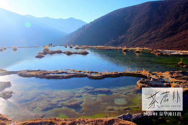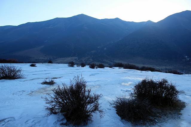 日出之前,川西的冷空气让我抗拒到有些不想下车,从泉华滩流出的泉水沿着陡峭的山坡形成了一道宽宽的冰瀑;山顶的月亮尚在,白白的挂在冷清的天上,看着它的时候脑子里想起了仓央嘉措的那首著名情歌:在那东山顶上,升起白白的月亮……