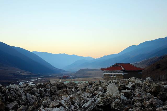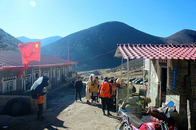 上车后昏昏欲睡三个小时,车道从柏油路变成了泥土路,在日出之前抵达了贡嘎山西坡的康定市贡嘎山乡(原六巴乡)玉龙西村。泉华滩便在不远处的山坡之上。