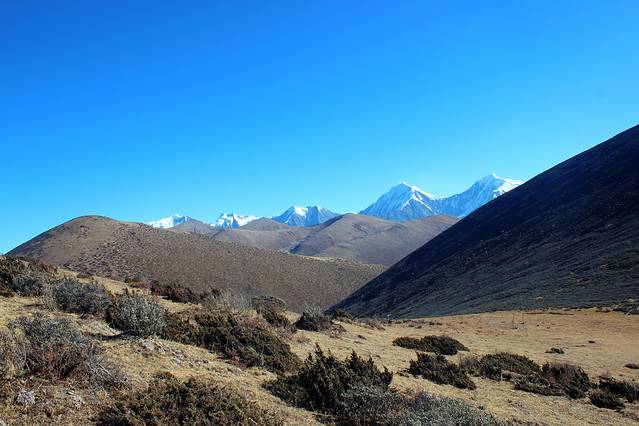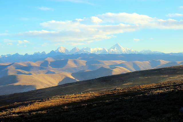 寒风里,踩着脚下的低矮灌木前进,这些灌木都被冻得酥脆,一脚下去,仿若踩到脆脆的薄冰上一般,发出咔咔的声响;眼前则是连绵不断的雪峰,这是独属于青藏高原的雄伟壮丽。