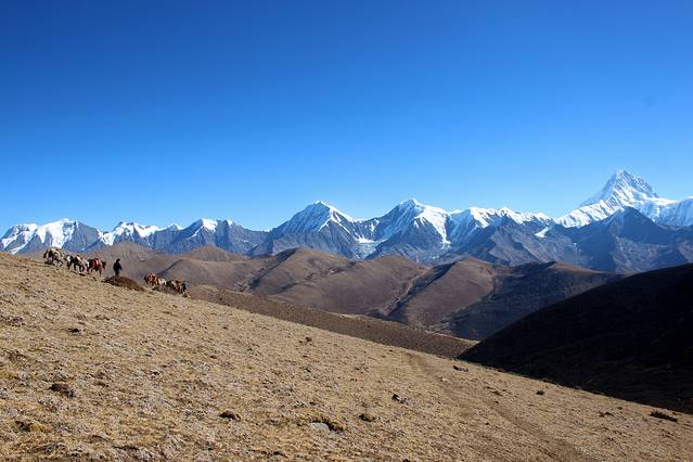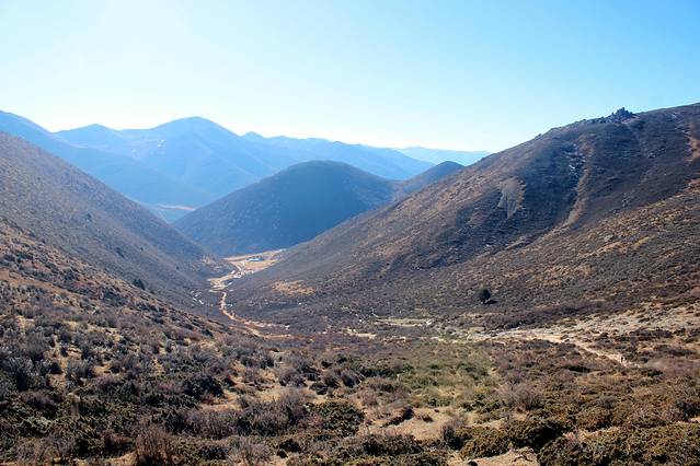 这个季节的大山一片青黄色,马帮走过身边,将干燥的灰尘扬起,被山间的大风吹得四野飘散;顺山而下的山泉一半结冰,一半继续叮咚前行。风景不算好,但是这开阔的天地却能让人有一种无比自由的感觉,仿佛即便没有翅膀,也能自在在这天地间翱翔一般。