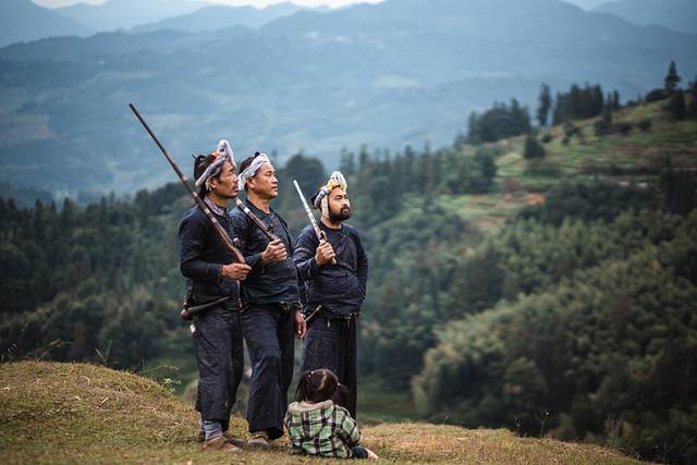 岜沙男人崇尚武力,平时都是穿当地特色布料做的的无领右开衫铜扣青布衣,直统大筒裤,常年身挎腰刀,肩扛火枪,上山打猎,下河打鱼都不在话下。