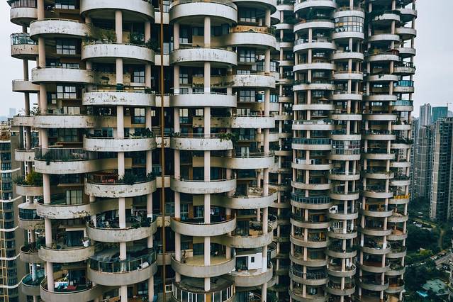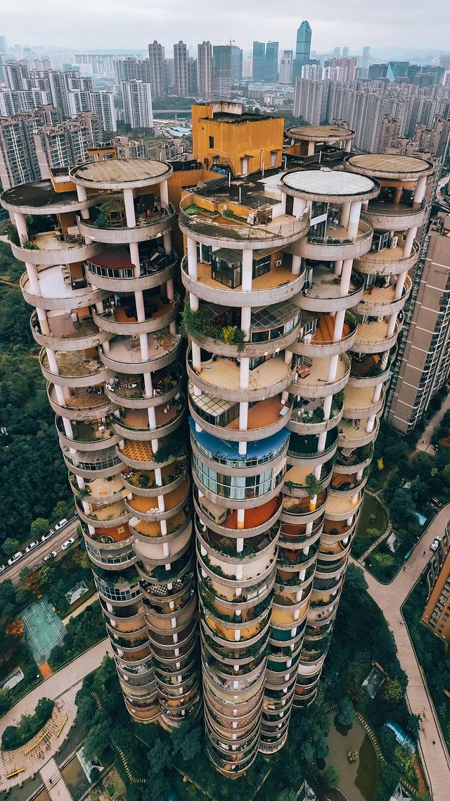 一共有四栋高楼,每一栋都是圆柱形,层层交错。每层楼都有一个超大的露天的阳台,宛如空中花园,阳台上铺满了彩色的地砖。