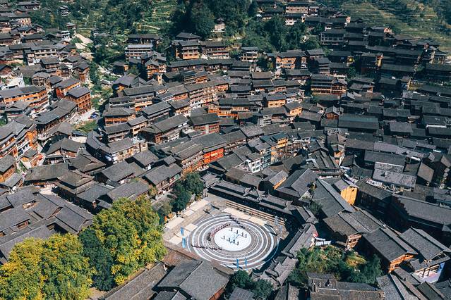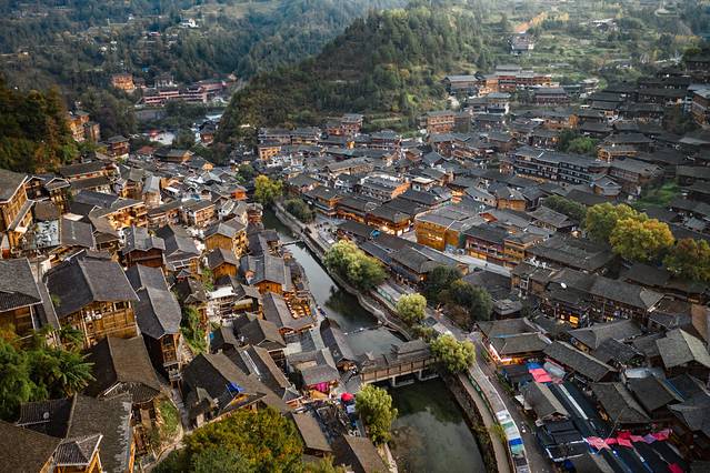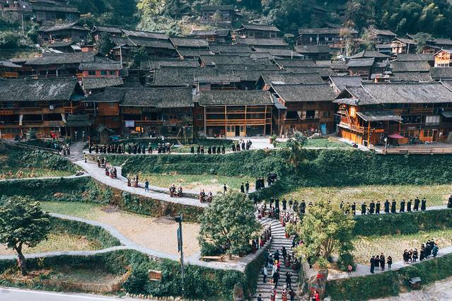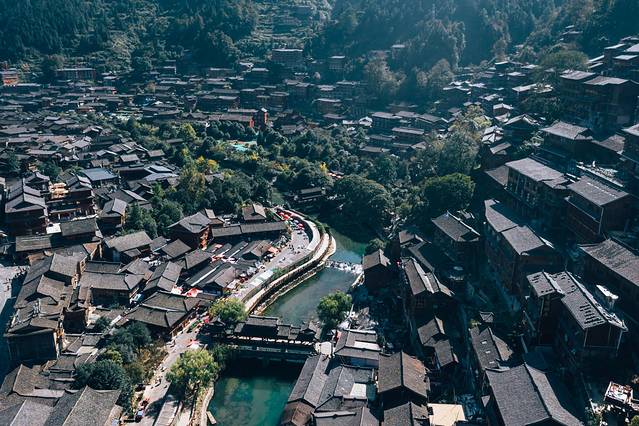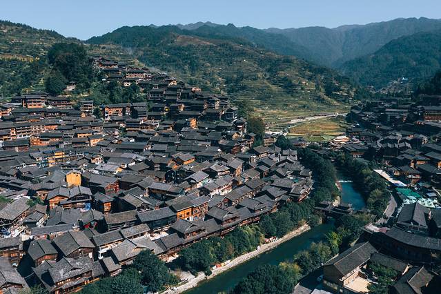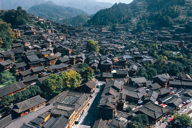 西江千户苗寨是今年大热的旅行目的地,它是全世界最大的苗族聚居村寨,由10余个依山而建的自然村寨相连而成,是一个苗族原始生态文化“博物馆”。苗族建筑以木质的吊脚楼为主,为穿斗式歇山顶结构,从苗寨内横穿而过的小河是白水河。航拍下层层叠叠的木房屋,有点“千与千寻”童话故事的味道。