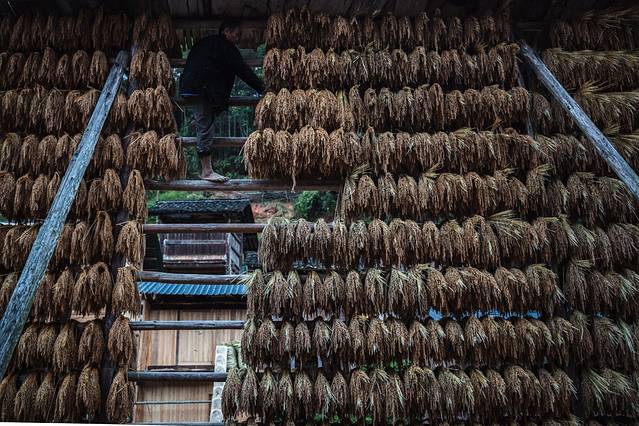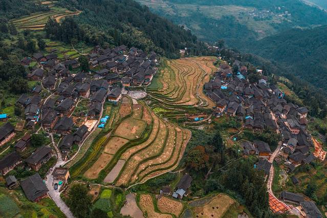 怎雷水寨分为3个寨子,上、中、下寨,以坐落于山间从上到下的位置区分。用航拍可以把三个寨子拍在一起。在水族人的眼里,最好的土地都应该用于耕种,所以他们的住房都修建在山顶上,而相对平坦的地方,用于修筑梯田,仿佛大地的调色盘。我们去的季节水稻已经收割了,所以景色没那么美了,再早些日子如果能看到金色的稻田,那一定是绝美的。