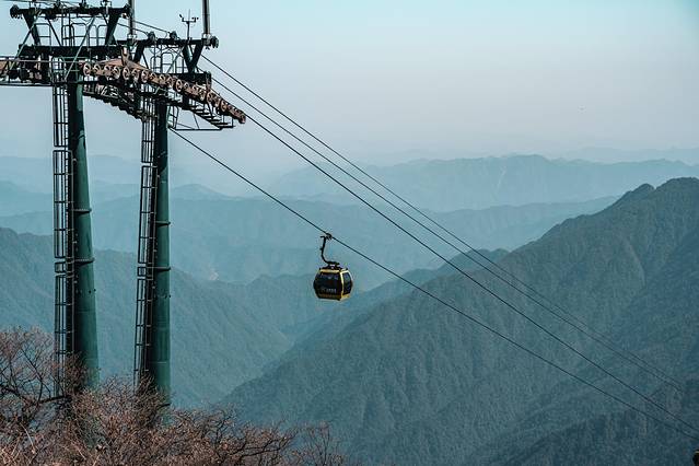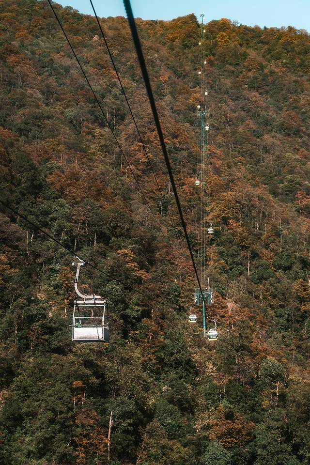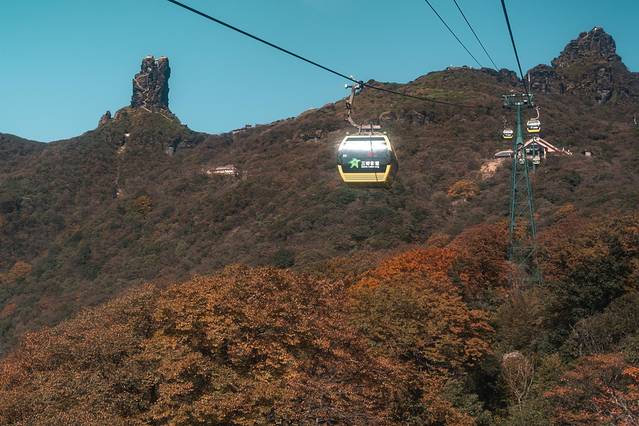 坐上缆车,终于开始了真正的登山之旅。梵净山的缆车是奥地利产的,缆车速度是根据风速大小调整的,大概15-30分钟之间,有一段特别陡,看起来快90度了,就是下图里面这段。