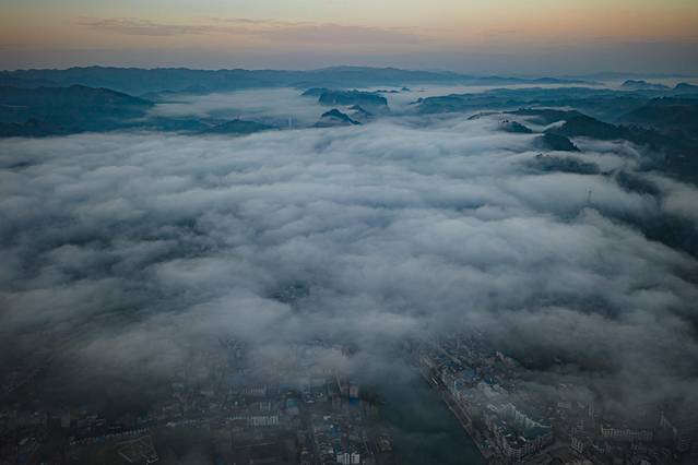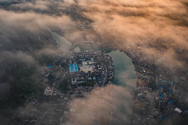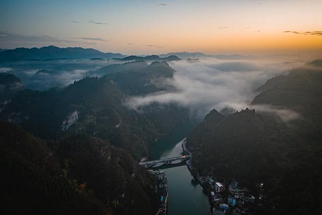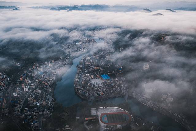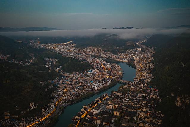 早上天还没完全亮,还有一些路灯亮着。航拍都是张力早起去拍的,他一路都致力于想拍云雾缭绕的照片,终于在镇远,有了这场完美的云海日出。