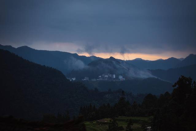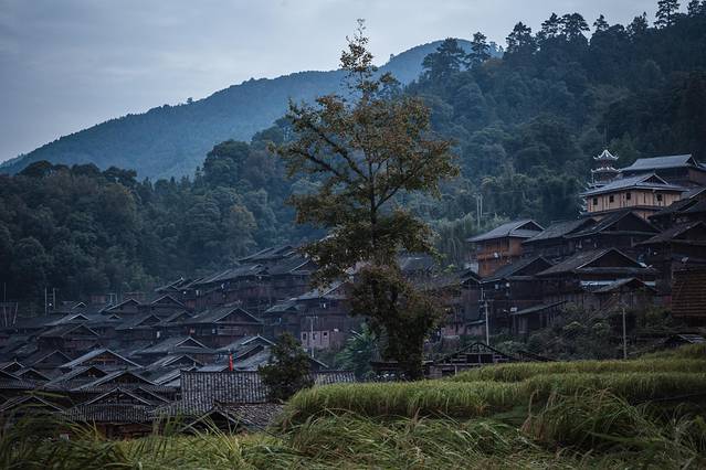 但是今天运气不佳,没有晨雾。因为周围山很高,也看不到破晓的日出。只拍到了清晨苗寨陆续亮起灯光,开始苏醒的感觉。