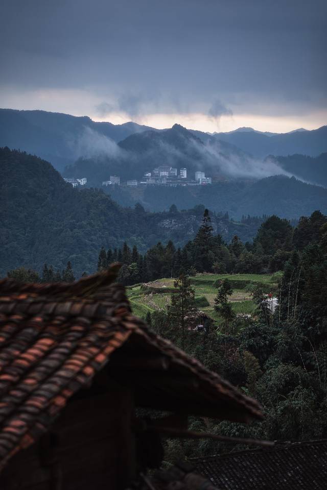入口处是通往上寨的路,在入口处往左边山上走一小段就能到达观景平台,适合没有航拍的游客拍全景照。这个角度也很适合用长焦拍摄,可以拍到穿梭于上寨的一条小路,有些人家已经开始做饭,屋顶上飘出淡淡的炊烟。放眼远望,山峦重叠,云海茫茫,岁月静好,恍如避世的山村。