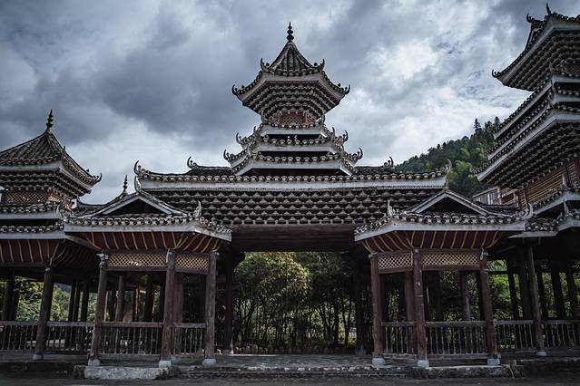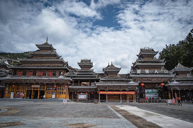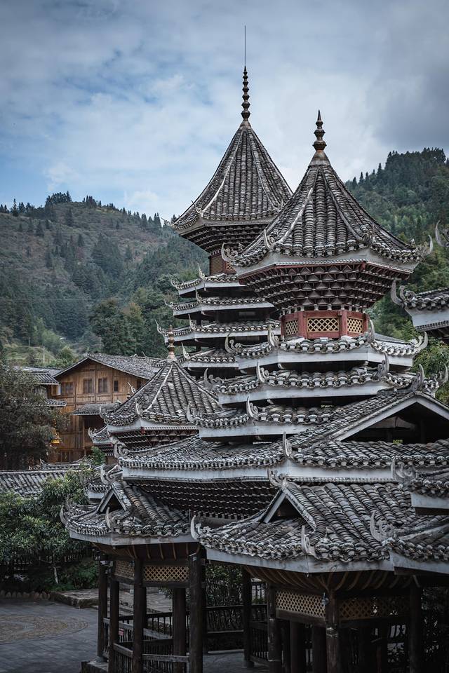辨别寨子是不是侗族,最简单的就是看有没有鼓楼和风雨桥,因为鼓楼和风雨桥是侗寨特有的标志。鼓楼从外观看像一座宝塔,比房屋都要高,所以一眼就能看见。鼓楼全部以榫卯结构衔接,历数百年风雨而不朽,可以堪称“建筑艺术”。