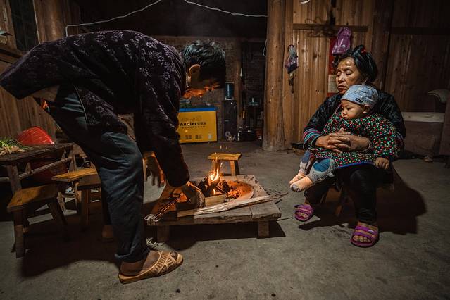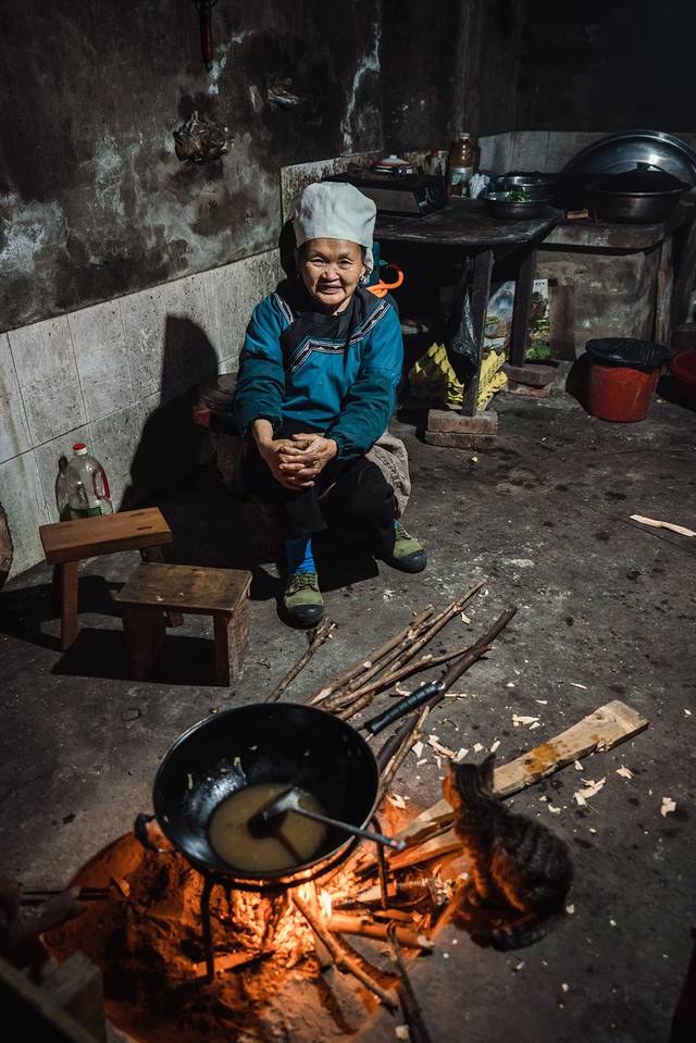 这个时间,正巧是他们晚饭的时间,看到他们厨房的灶台,比我小时候老家的更破旧。客厅的灯光非常昏暗,厨房仅有一盏并不明亮的灯。烧柴依旧是他们烹饪的主要方式,一家子围在锅炉边吃饭,一锅乱炖是他们唯一的食物。柴火堆旁边还躺着一只小奶猫在烤火,老奶奶和小奶猫在一起的画面很温馨。